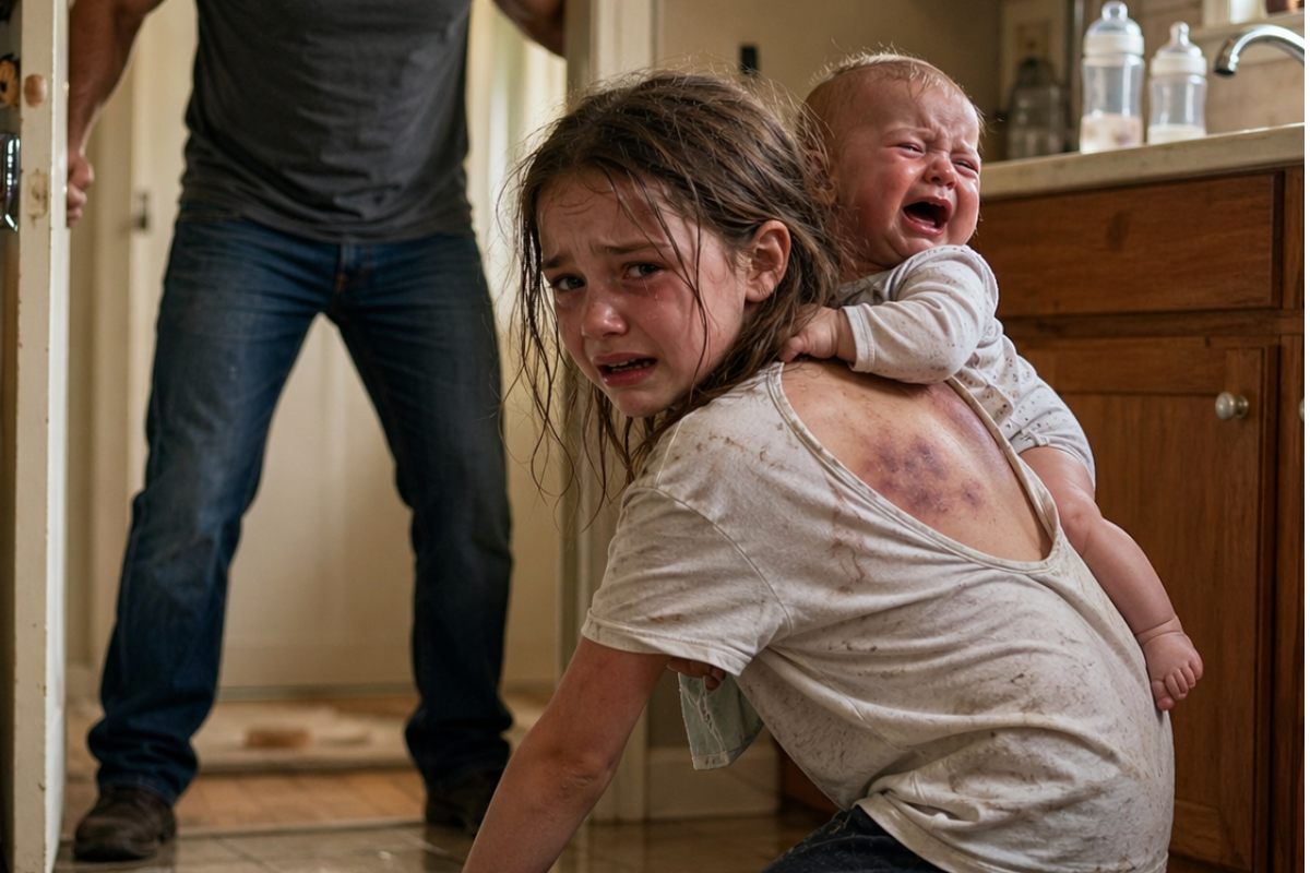 “DAD, I CAN’T CARRY THE BABY ANYMORE” — YOU RUSH HOME TO FIND YOUR 8-YEAR-OLD SCRUBBING THE FLOOR WITH A BRUISED BACK… THEN YOU DISCOVER YOUR WIFE’S SECRET PLAN TO TAKE EVERYTHING