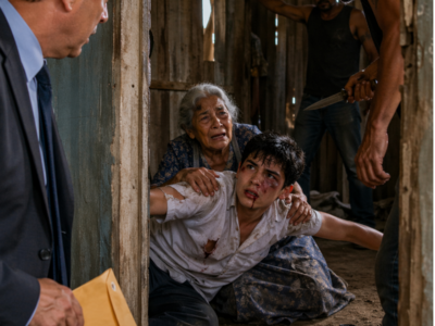 Mateo was on the dirt floor, bleeding from the mouth, curled over his grandmother like a shield. His thin body covered hers from the shoulders down while two grown men kicked him and shouted for money. A third man stood near the table, knife in hand, swiping aside medicine bottles, a prayer candle, and a tin box that had likely held every dollar that family owned. The old woman beneath Mateo was trembling so hard the chair legs around her rattled against the floor.