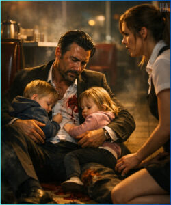 The cruel tension left his shoulders. The steel in his face softened. He reached out with scarred fingers and touched the little girl’s cheek, then the boy’s hand curling from the blanket.